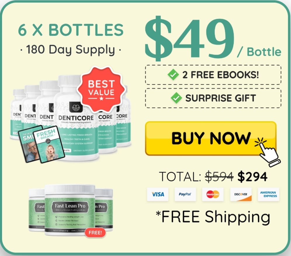 Special Offer: When you purchase 6 bottles of DentiCore, you’ll receive an additional bottle of the supplement Fast Lean Pro completely free — giving you an extra boost for overall wellness while taking care of your oral health.